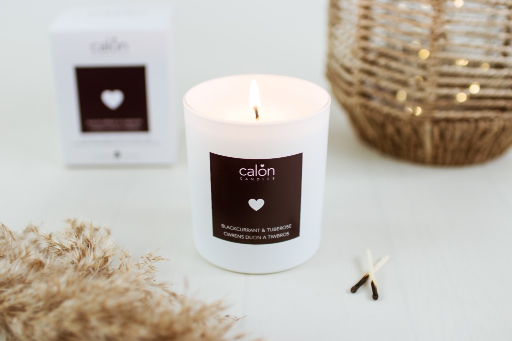 The Blackcurrant and Tuberose Candle is hand-poured alongside all of our Welsh candles in our studio in Carmarthenshire, where we use coconut and rapeseed waxes that are specially designed for candle use, and are both vegan-friendly and cruelty-free. The waxes are poured into our signature chalky white glass jars, then affixed with the bilingual label in both Welsh and English.