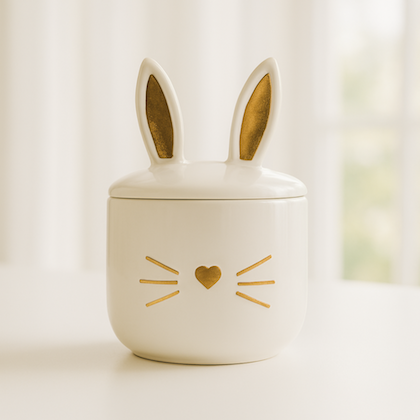 A super cute ceramic trinket jar complete with gold bunny nose, ears and whiskers. Perfect for hiding Easter eggs, or even cotton wool make-up pads!