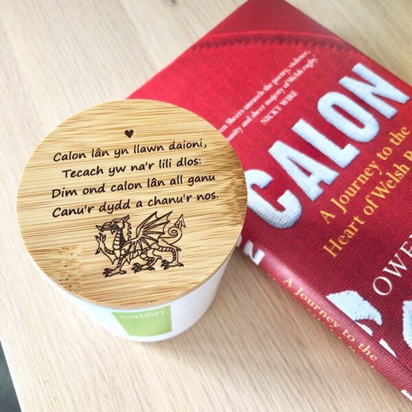 Bursting with pride in our home country of Wales, we have developed our Calon Lân Candle featuring the lyrics of Calon Lân atop an engraving of the Welsh dragon that you can pop on top of your favourite signature candle. The bamboo lid makes storage and safekeeping of your candle a breeze, and fills you with thoughts of home – no matter where in the world you are lighting the candle.