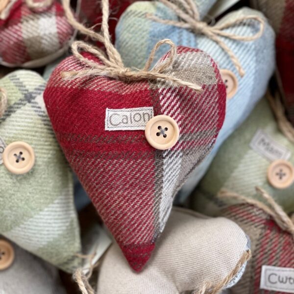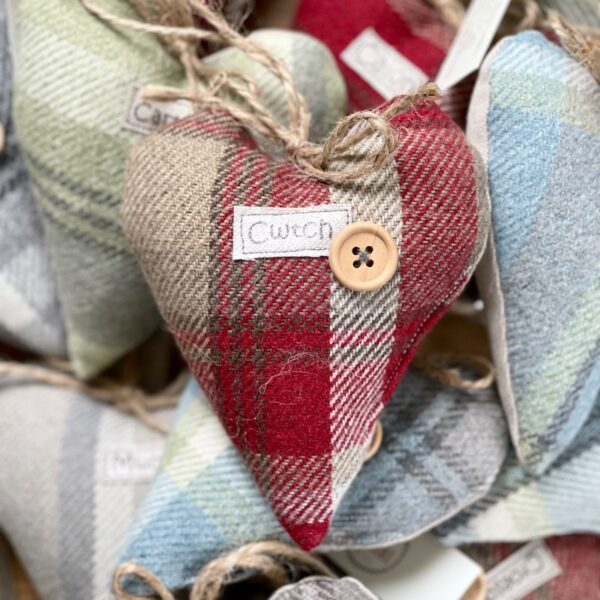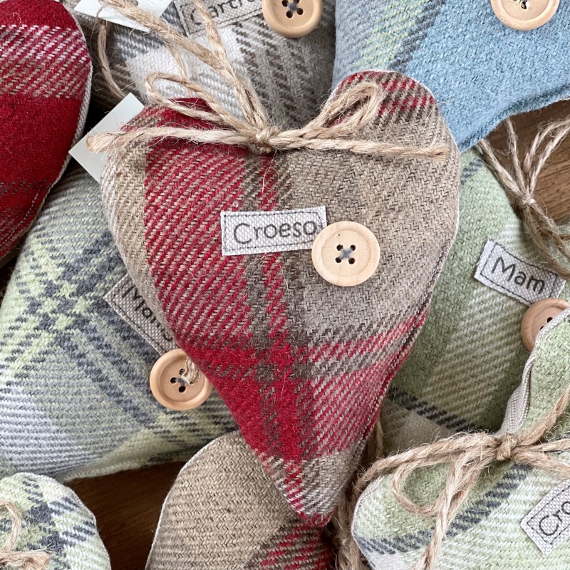 Handmade using a lovely chequered wool fabric in a range of designs and colours (see first image), with the words sewn onto a lovely cream linen look fabric. Finished with a wooden button, a jute twine hanger and bow and filled with premium hollow fibre. Made in Wales.