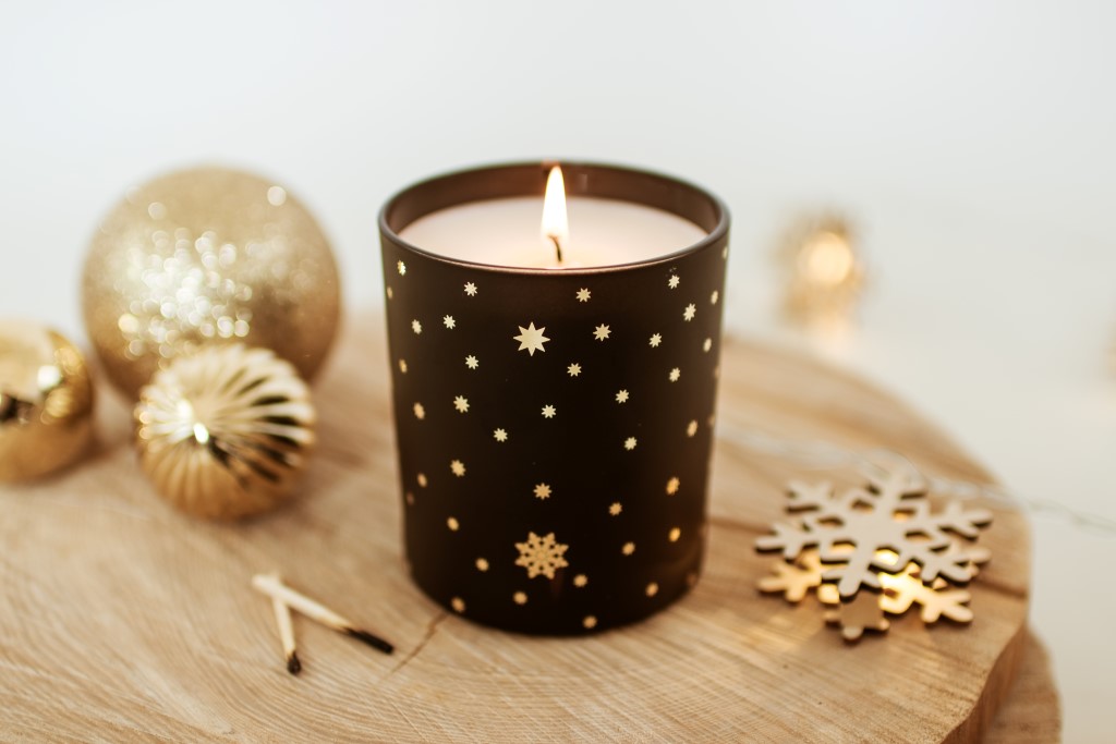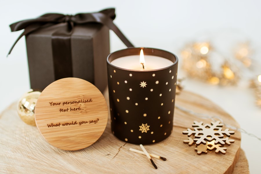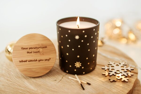 A beautifully festive Christmas candle in a matt black glass with a gorgeous star and snowflake design, in your choice of either gold or silver. This luxury scented candle is fragranced in the premium scent of Frankincense & Myrrh and option to include a branded bamboo lid,, or you can upgrade to a personalised lid.