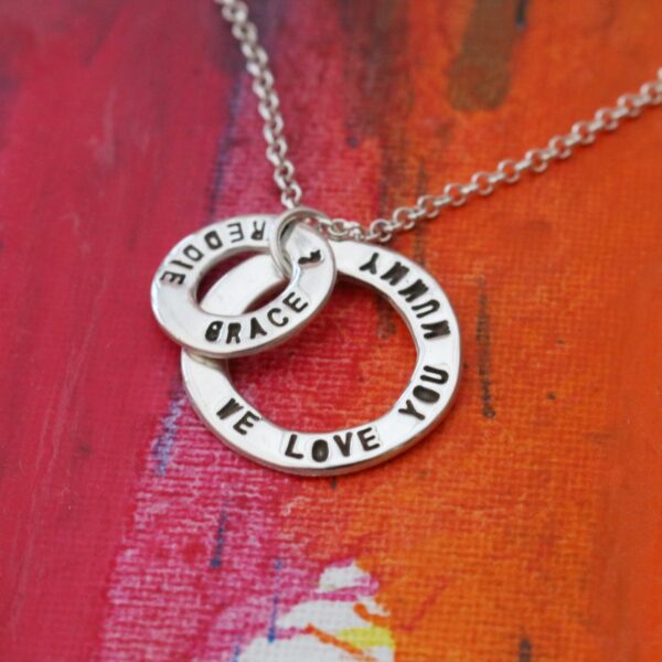 A duo of Fine Silver polo hoop pendants – one large and one small – with your choice of personalisation and hanging beautifully from an 18″ Sterling silver belcher chain necklace. Would make a lovely Mother’s Day gift for a special mum.