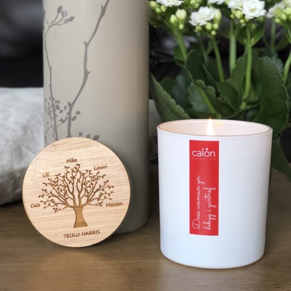 You can choose any of our signature scents for this personalised family tree candle, whether you prefer fresh florals, something fruity, or an earthy, woody vibe. Select your favourite from the dropdown box or peruse our collection of Welsh candles to learn more about the fragrances.