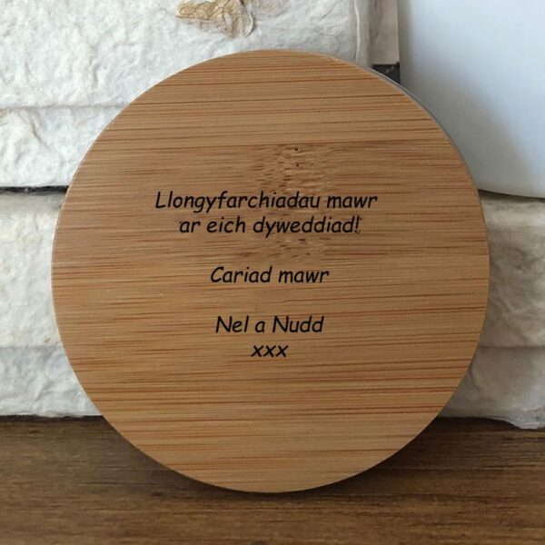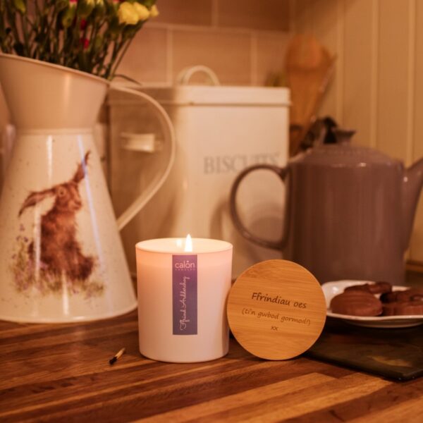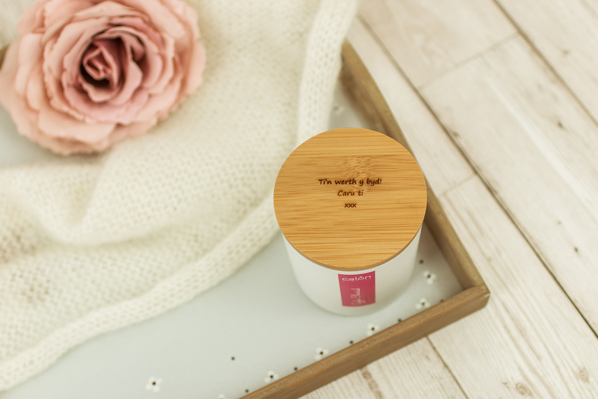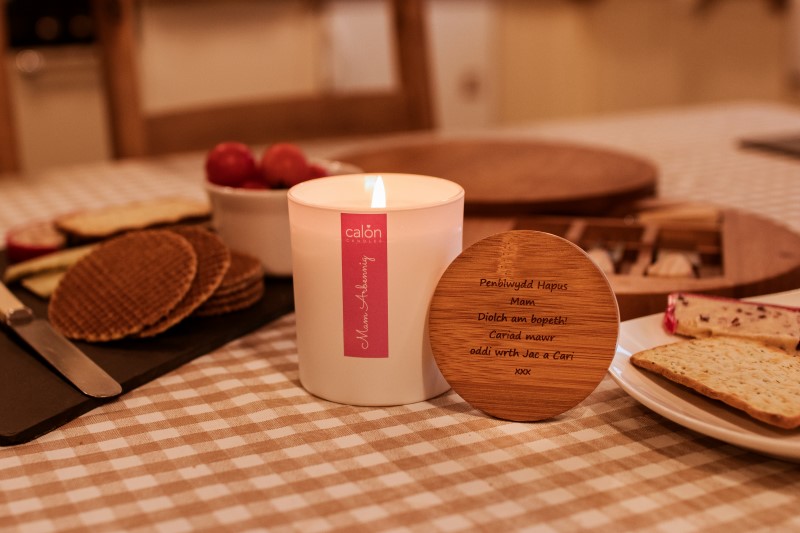 It also makes a lovely gift for friends with our Ffrind Ardderchog label; as well as a wonderful candle for mums with our Mam Arbennig label in a vibrant pink colour.