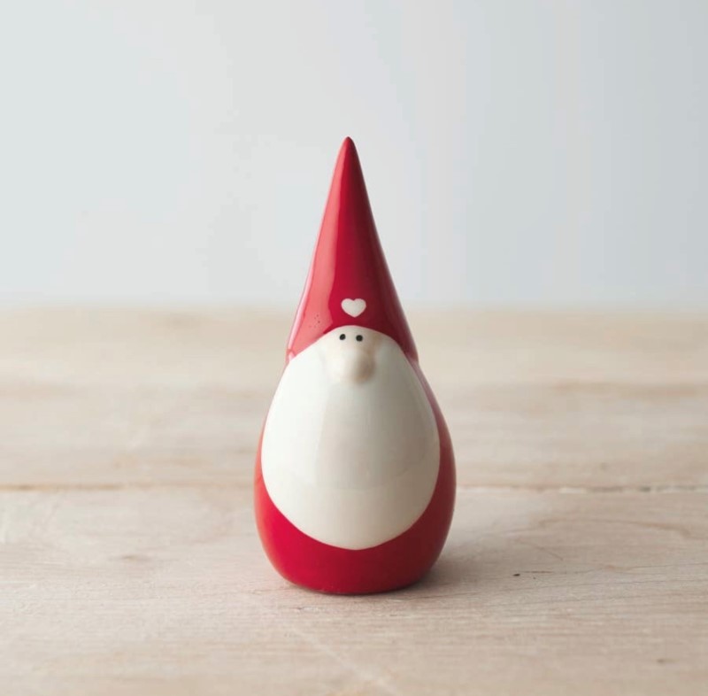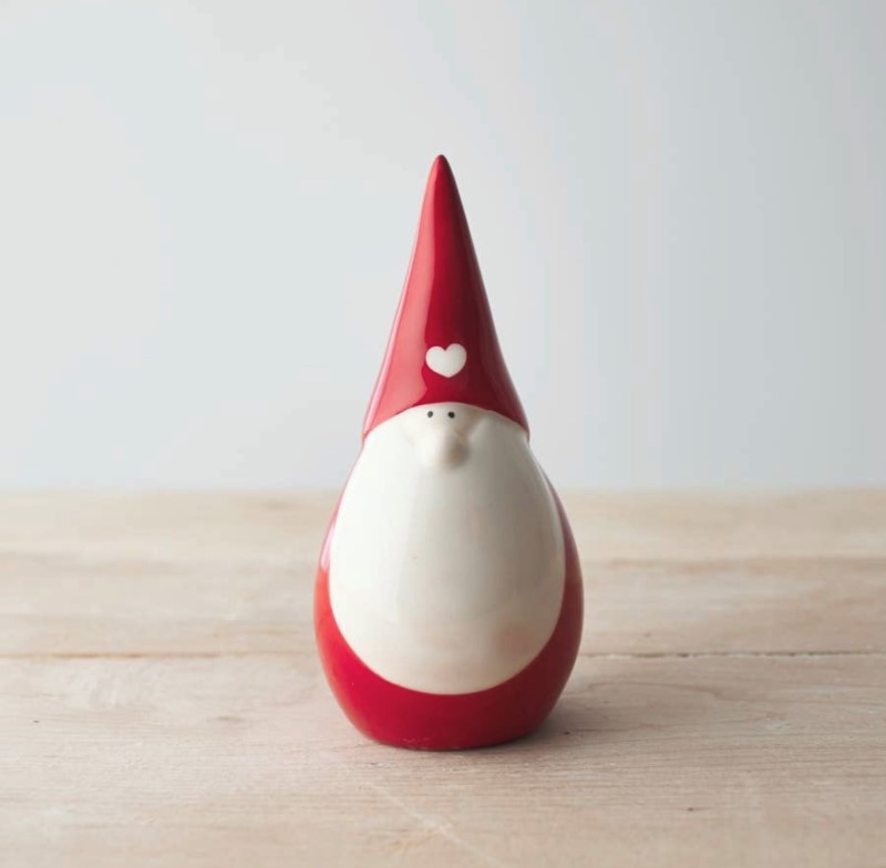 A fun and festive plump ceramic gonk in red and white with a sweetheart feature.