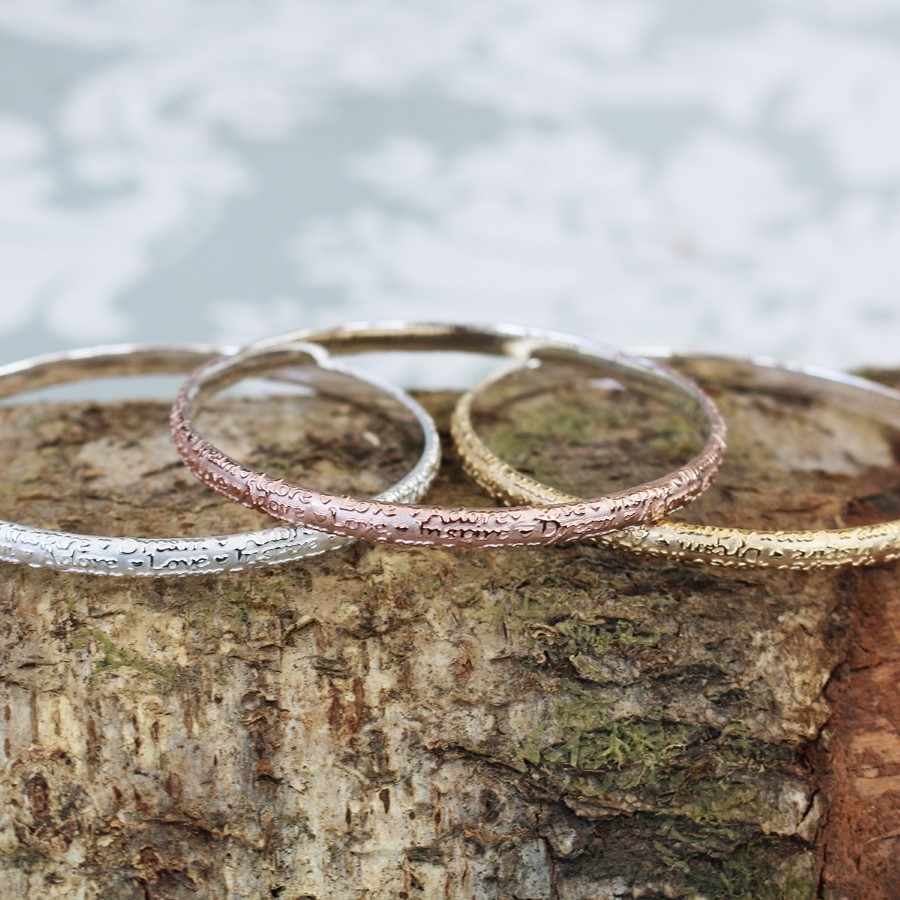Our exquisitely designed sterling silver Script Bangle is etched with some of our favourite words; Dream, Inspire, Love and Adore. This stunning bracelet is truly unique and says all those “hard to say” things so you don’t have to!