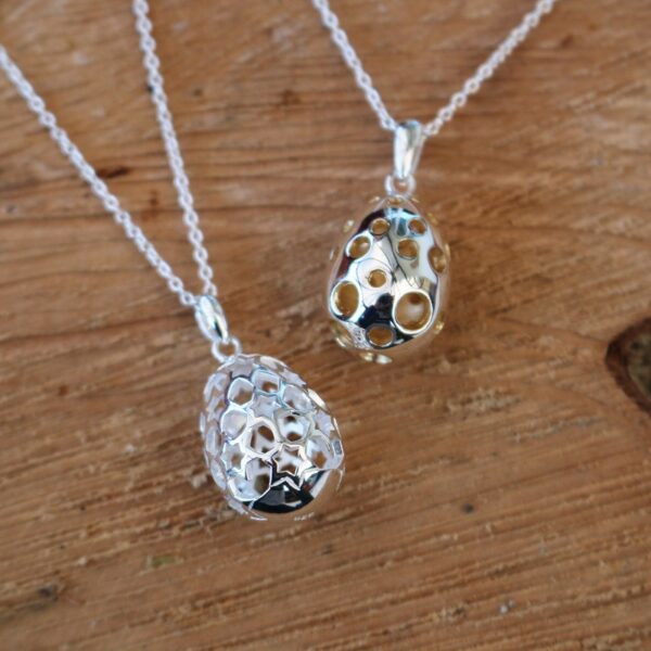 This sterling silver egg has a beautiful cut out design and hangs from an adjustable long 24-26″ sterling silver chain. This is a necklace that can be enjoyed by all ages and looks fabulous worn with a white shirt or over a jumper. Please note this is for the silver egg (on the left in the image).