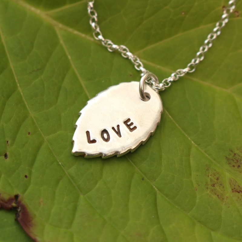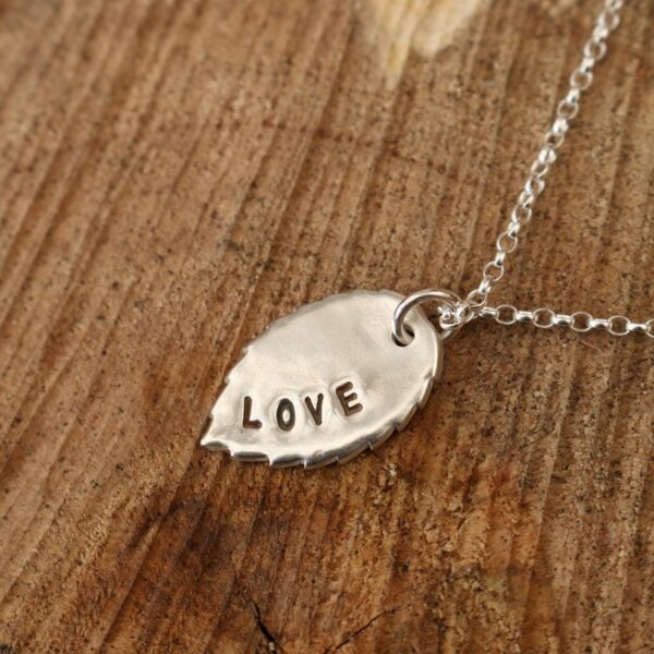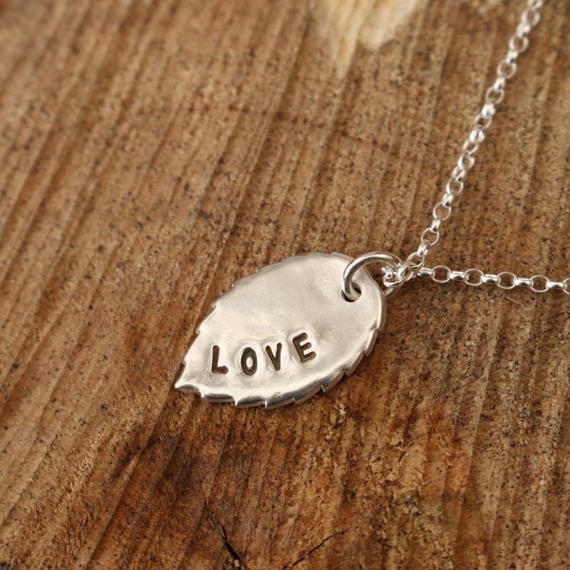 Our small leaf-shaped pendants can be hand-stamped with up to 6 characters along the outer edge of the leaf, and have the veining from a leaf from our garden on the reverse. Each one different and lovingly hand-made to order. Have a longer name to add? Check out our medium personalised leaf pendant instead…