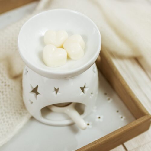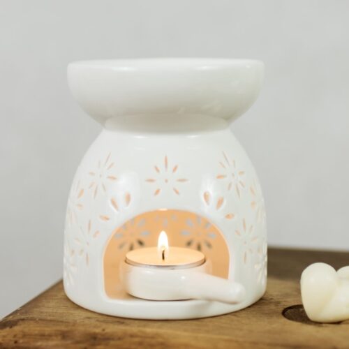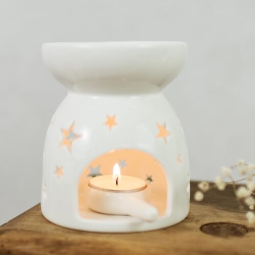 This stunning tealight burner and wax warmer features an all-over celestial design with shining gold moon accents. A star cut out shape holds a single tealight and creates a magical ambience when paired with our long-lasting and highly fragranced wax melts.