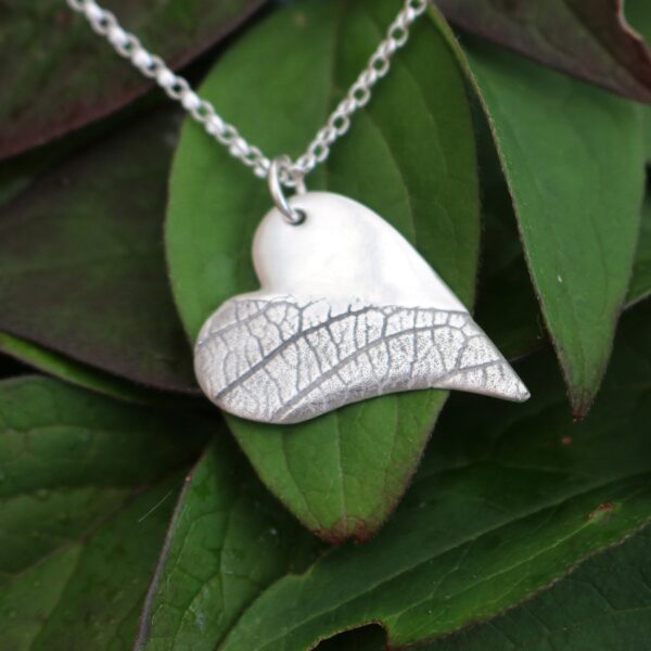 Created in fine silver using the imprint of a leaf from the garden, each wavy heart pendant is beautifully unique. Comes complete with a sterling silver curb chain.